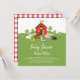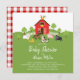 Chá de fraldas moderno de animais de exploração com celeiro vermelho com animais de exploração em pastagem verde. Sacudir nosso adorável convite para o chá para ver uma coordenação de gingham vermelho atrásPerfeito para um chá de fraldas de meninas, chá de fraldas de meninos ou chá de fraldas neutro em relação a gênero.