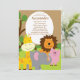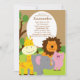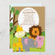 Bem-vindo à Selva! Alguém está tendo um bebê! Não tenho certeza se é um garoto ou uma garota? Este convite para chás de fraldas também é excelente de um convite para chás neutro. Ele tem um fundo azul claro com uma árvore do lado esquerdo e colinas rolando e grama do fundo. Há uma girafa amarela fofinha na frente da árvore. Ao seu lado está um elefante, um adorável porco rosa com um leão marrom atrás deles. Personalize com as informações de seu partido. Veja as diferentes cores e designs nesta linha. ©babystar