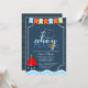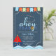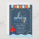 Este design de convite para chá de fraldas apresenta um tema náutico para um rapaz que inclui um pequeno barco azul bonito com bandeiras vermelhas, uma faixa texturizada de cor suave, uma âncora e uma corrente metálica de cinza azulada 3D, um volante laranja decorativo, ondas de oceano azul bebê e um fundo listrado azul de dois tons.