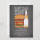 Hambúrgueres modernos e divertidos e hambúrgueres de chalkboard e casais de churrasco de cerveja convite para chá de fraldas com uma garrafa de cerveja com um enorme hambúrguer colocado sobre um fundo preto de chalkboard e um pano de checker vermelho correspondente para um toque especial.