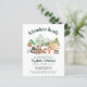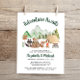 Casais rústicos, de cariz orçamental, convidam chás de fraldas com uma ilustração fofa de animais de floresta acampar com a tenda e a fogueira nas montanhas e na floresta e "Aventura Aguarda" e os nomes da mãe e do pai num roteiro verde-escuro.