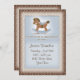 Nosso cavalo balançando tem estrelas minúsculas na sela e no foguete. O fundo está em marrom escuro com estrelas minúsculas espalhadas ao redor. A data, hora e local do convite estão na frente com registro, hospedagem e RSVP no verso. Esta design também vem em selos postais.