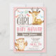 O convite para chá de fraldas de cervo e coruja, cor-de-rosa e castanho. Recursos encontrados, coruja, flores e borboletas.