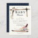 Arca de vô com penas, cristais, setas e flores enquadra um delicioso convite para chás de fraldas. Acompanhado de padrões de bolinhas azul+preto e creme. Perfeito para qualquer momento e para qualquer dos sexos. Seus convidados irão antecipar um evento divertido e único. Um pouco esperto, um pouco ocidental, e um pouco rústico.