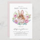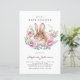Convide convidados para o seu evento com este convite de chá de fraldas personalizável. Apresenta uma ilustração fofa de coelho com flores rosa e lilás. Personalize este convite para chás de fraldas florais adicionando seus detalhes. Este convite para chás de fraldas de coelhos é perfeito para qualquer tema ou estação.