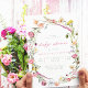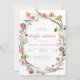 Um convite bonito para chás de fraldas que inclui uma coroa floral de flores de aquarelas em rosa, mauve, amarelo e branco. A manchete, chá de fraldas, está em fontes de caligrafia moderna rosa/mauve. Personalize com seus detalhes.