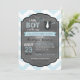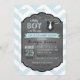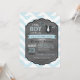 Fundo impressão de fevron azul e branco com jumper poka-dot com gravata, fralda e botas no cartão de convite para chá de fraldas do garoto da linha de clothesline.