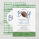 Convite para Chás de fraldas de futebol dos Green Xadrezes Simples é um convite para chás de fraldas temático de futebol de menino, com uma aquarela de futebol, texto decorativo azul, touchdown e um padrão de xadrez verde. Excelente para que em breve sejam pais amantes do futebol.