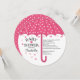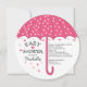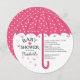 O círculo redondo moderno morre cortou o convite do chá de fraldas com um guarda-chuva rosa de bolinhas para um chá de fraldas feminino. Sacudir nosso chá de fraldas guarda-chuva para ver uma bolinhas rosa e branca bonito de volta para um toque especial extra. Perfeito para um chá de fraldas de verão, chá de fraldas de primavera, chá de fraldas de outono ou chá de fraldas de inverno.