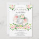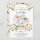 Design de chá de fraldas bonito com um elefante adorável cercado por buquês de flores rosa bonito. Sacudir o nosso convite para ver uma floral coordenada de volta para um toque especial extra.