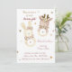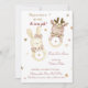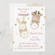 "Um chá de fraldas encantador, com um design macio e de cor pastel, com um belo coelho e um bufo de cervo. A elegante tipografia anuncia a celebração de meninas gêmeas, criando uma atmosfera quente e alegre. Perfeito para um evento de chá de fraldas doce e memorável."