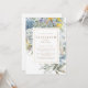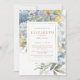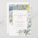 Fundo branco. Azul Floral Hydrangea & ouro girassol. Convite para chás de fraldas. Dourado texto.