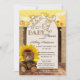 Um convite de chá de fraldas rústico com um ursinho de pelúcia sobre um fundo com madeira e burlap, girassol e aves estilizadas. Bonita celebração no estilo country.