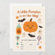 Celebre sua abóbora no caminho com este adorável convite de chá de fraldas de Halloween! Apresentando uma abóbora sorridente, fantasmas bonitos, morcegos, milho doce e essência de bebê em um design festivo de queda, esta modelo é perfeita para as mães estarem hospedando uma queda ou chá no Halloween. A design lúdica e neutra do ponto de vista do gênero funciona para bebês, meninas ou gêneros surpresa. Personalize com seus detalhes de eventos e encantem convidados com um convite de chá de fraldas único e sazonal!