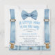 Celebre a chegada do seu homenzinho com este adorável convite para chás de fraldas! Com uma charmosa gravata azul de arco e suspenders design, este cartão é perfeito para uma celebração sofisticada e na moda. A paleta de cor azul macia e a ilustração fofa criam uma lembrança memorável para os convidados apreciarem. Personalize-o com os detalhes da sua festa e torne a chegada do seu homenzinho ainda mais especial. Este design único impressiona certamente a sua família e amigos, fazer-o a escolha perfeita para qualquer chá de fraldas moderno.
