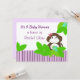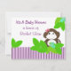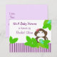 Uma bela faixa roxa através do fundo do chá de fraldas. Plantas da selva rodeiam este macaco fofo com um arco de cabelo rosa. Personalize com todas as suas próprias informações conforme desejado.
