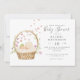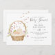Convite de Chá de fraldas Horisontal com um bebê aquarela dormindo numa nuvem num cesto de páscoa com folhagem, tulipas e corações coloridos voando no ar.