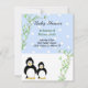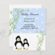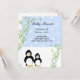 Um fundo macio de azul com bolinhas brancas. Vinhas e folhas e pinguins bonitos fazem disso um tema de chá de fraldas divertido. Personalize com todas as informações do seu chá de fraldas conforme desejado.