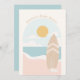 Este surf bonito e moderno, convite à praia apresenta uma prancha de fundo de madeira numa praia com conchas dispersas. O lado azul do oceano fornece detalhes da festa.