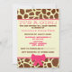 Um convite de chá de fraldas com um fundo de impressão de girafa na frente e atrás. A frente apresenta um arco cor-de-rosa e cor-de-rosa na parte inferior. Personalize o texto cor-de-rosa e marrom no centro com detalhes da sua ocasião. Procure outros itens de impressão de girafa na Paperie da Jill.