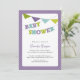 Pacotes coloridos e um sotaque em negrito este convite para chás de fraldas.
