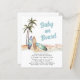 Um convite para chás de fraldas, com um bom orçamento, apresentando uma cena de praia em aquarela com palmeiras, praias arenosas e pranchas vibrantes e marrom, e "Baby on Conselho" em um divertido roteiro azul. Adicione o nome da futura mãe e os detalhes do chá em simples caracteres modernos. Este papel semirbrilhante do orçamento é semelhante em peso ao papel fotográfico. Também está disponível uma versão maior do estoque de cartão tradicional 5x7 (mensagem para o link).