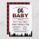 Querida! Este convite para xadrez impresso de frente e verso é perfeito para um chá de fraldas de co-ed celebrar a chegada de um menino ou menina. Inclui padrão de verificação de búfalos vermelho e preto e silhueta de árvore. Ideal para uma festa no outono ou no inverno, um lenhador, uma aventura ou um tema ao ar livre ou uma cabana de vestimenta flanela.