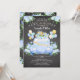 Dirigir por design de chá de fraldas com um carro azul com presentes, balões e buquê de flores azuis bonito em um quadro preto de fundo. Sacudir o nosso convite para ver uma floral coordenada de volta para um toque especial extra.