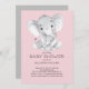 Convite para o chá de fraldas elefante com a mãe cinza e girafa de bebês em um fundo cor-de-rosa para um chá de fraldas feminino. Sacudir o nosso convite para ver um fundo de cinza coordenador para um toque especial extra. Visite nosso compro para ver itens correspondentes.