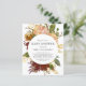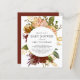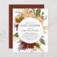 Um belo convite rústico para chás de fraldas que apresenta um buquê floral de cor d'água em tons de paprika, laranja, burgundy, castanho, dourado, rosa, pêssego, ferrugem, marfim e creme em volta do texto de cinza escura em um círculo branco. O inverso é uma sombra equivalente de burgundy. Ideal para um chá de fraldas de outono.