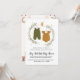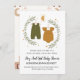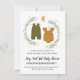 A primeira imagem é um convite para chás de fraldas para gêmeos, apresentando um design quente e elegante desenhado à mão No centro, duas roupas de bebê estão penduradas em cabides de madeira: Um cortador verde escuro para o menino, com botões dianteiros. Uma roupa cor de laranja-acastanhada para a menina, com mangas e botões curtos e recheados. Ao redor das roupas está uma coroa de ramos verdes formando forma circular, decorados com pequenas estrelas dispersas. No topo, há uma ilustração de uma lua crescente sorridente com raios solares suaves ao seu redor. Abaixo, o texto é escrito em na moda verde e marrom, fornecendo detalhes sobre o evento, incluindo o nome da mãe, a data, a localização e as informações do registro da dádiva. O logotipo da Ilha das Saudações está no canto inferior direito. O design usa tons quentes e úmidos como verde-oliva, castanho e ouro, criando um conforto e convidando a se sentir perfeito para a ocasião.