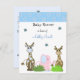 Um design bonito com uma borda de estrelas azuis e brancas. Duas girafas, uma em marrom azul e chocolate, a outra em café e marrom chocolate, um elefante rosa e azul macio atrás de arbustos verdes. Personalize com as informações mostradas conforme desejado.