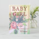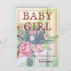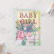 Um convite para um chá de fraldas de menina com flores na frente e informações sobre eventos na retaguarda.