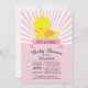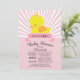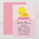 Convite moderno a Chá de fraldas ousado e fofo, apresentando um pato amarelo fofo para um chá de fraldas de meninas. Nosso convite clássico de pato de borracha apresenta um pato doce com um arco cor-de-rosa e banner contemporâneo em um fundo de faixa radial de rosa claro e vintage branca e tem um retorno correspondente para um toque especial extra. Perfeito para um chá de fraldas temático de pato para uma menina.