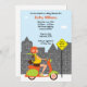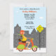 Este convite de chá de fraldas único mostra uma mulher grávida a andar de ciclomotor colorido na cidade. Este convite só está esperando para ser personalizado com seus detalhes. Alguns elementos Baby Star Design