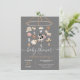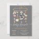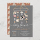 Convites modernos e fofos para bebês de animais de fazenda. Scandinávia excelente com uma vaca, carneiro, porco, galo, cabra, rastreador, arco-íris, nuvens e estrelas penduradas num celular. Esquema de cor neutro para ser um menino ou uma menina. Terra cotta, cinza azul empoeirada e branca.