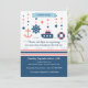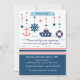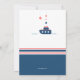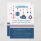 Um doce design com elementos náuticos suspensos (âncora, leme, barco, conservador de vida), de linhas de pontos e estrelas. O fundo é branco e azul profundo com um centro de distribuição.