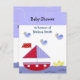 Uma cena fofa no lago, um veleiro vermelho, branco e azul com pequenos patos amarelos na água e pássaros azuis no céu. Personalize com todas as informações do seu chá de fraldas conforme desejado.