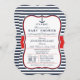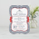 Convite náutico elegante para chá de fraldas em faixas azuis marinhos, padrão riscado. Apresenta cores azuis, brancas e vermelhas do marinho com elementos de design formal de âncora e vintage.