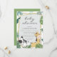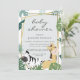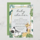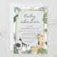 Floresta branca e na moda com convite a chás de fraldas de animais. Design apresenta grande borda de folhas, estrutura interna de ouro duplo com uma zebra e girafa no fundo. A parte de trás do convite é faixa diagonal verde e branca. Personalize este convite com os seus próprios detalhes de chá de fraldas em letras de cinza de fumaça saborosas acentuadas com letra de estilo de script.