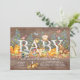 Benhos bonitos, animais de floresta, convite neutro que inclui uma coruja, raposa, guaxinim, veado, ouriço e urso bonitinho, em pano de fundo popular de madeira marrom. Um convite bonito para um chá de fraldas neutro em relação ao gênero para uma menina ou um menino. Visite nosso compro para ver este convite em outras cores.