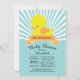 Convite moderno, ousado e fofo, de Chá de fraldas, com um pato amarelo giro para um chá de fraldas de bebês, chá de fraldas de meninas ou chá de fraldas neutro em relação ao gênero. Nosso convite clássico de pato de borracha apresenta um pato amarelo doce com um banner de laranja contemporâneo em um fundo de faixa radial de safra azul clara e branca e tem um retorno correspondente para um toque especial extra. Perfeito para um chá de fraldas temático.