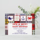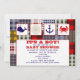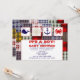 Um convite ao chá de fraldas temático do oceano com ilustrações no topo de uma baleia, um dólar de areia, uma âncora e um caranguejo. O fundo na frente e atrás é xadrez inspirada em retalhos. Personalize o texto com detalhes da sua ocasião.