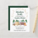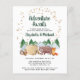 Casais rústicos, de cariz orçamental, convite para chás de fraldas com uma ilustração fofa de animais florestais com as tendas acampadas nas montanhas e na floresta, uma camada de estrelas de ouro e "Aventura Aguarda" e os nomes da mãe e do pai em um roteiro verde-escuro.