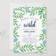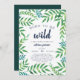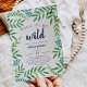 Adoráveis convites para chuveiros de bebês para o seu selvagem no caminho apresentam uma borda de vibrantes folhas verdes da selva de cores aquáticas. "Nascer de ser selvagem" aparece em marinho azul, com os detalhes do seu chá de fraldas embaixo.