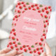 Convite para o chá de fraldas Berry Sweet com um padrão de morango em fundo cor-de-rosa e letra de contraste em negrito. Perfeito para primavera e chás de fraldas de verão.