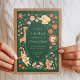 Convite para Chás de fraldas da Selva com ilustrações de leão, girafa, chita, tigre e elefante. Animais cártaros e bonitos com flores tropicais coloridas num fundo verde-florestal. A parte de trás é um padrão floral correspondente.