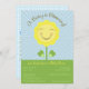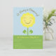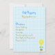 Adorável girassol sorridente com um belo ditado "um bebê está florescendo" no topo da frente. O verso é um gingham azul claro, coloque direções, registro ou outra informação sobre o seu chá de fraldas.