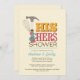 Este convite para o chá apresenta as ferramentas dele e dela para toda a casa. Cores brilhantes, incluindo amarelo, rosa e aqua.