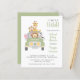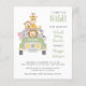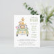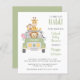 Um convite para chás virtual, amigável em orçamento, com uma ilustração de animais do zoológico bebê (leão, elefante, zebra, macaco e girafa) amontoado em um veículo safari e "Está prestes a se tornar selvagem" em tipografia divertida, e "Chá de fraldas" e o nome da mãe na coordenação de um roteiro verde do exército. Você pode personalizar facilmente os detalhes do chá virtual, mudar o texto "É um menino!" no veículo, e adicionar a data do chá na placa de licença, ou deixar o vazio.